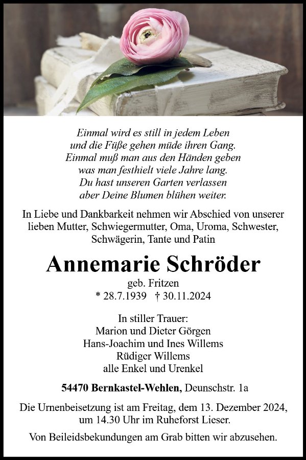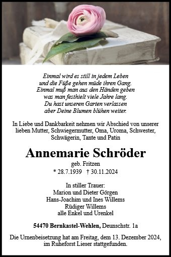Deine Lebenstür hat sich geschlossen. Ich danke Dir, dass Deine Tür immer für mich und meine Familie offen war und wir ein kleines Stück Deines irdischen Weges Dich begleiten durften. Das was Dich unvergessen macht, sind die liebevollen Geschichten und Erinnerungen die es von Dir gibt.