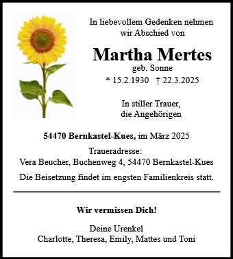 wir wünschen Ihnen für die kommende Zeit viel Kraft und dass es Ihnen gelingt, dankbar auf die positiven Erinnerungen zurückzublicken. Diese Gedenkseite möge Ihnen dabei helfen, Ihre Trauer zu teilen und das Andenken gemeinsam wachzuhalten.